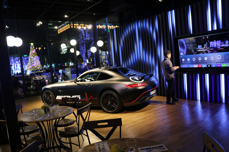 ![]() 「Mercedes-Benz概念館」外觀延續 Mercedes-Benz 獨特的設計美學,以大量的黑色與木質調性,搭配著外牆鉅幅75吋Samsung高解析度LED液晶電視以及絕美音色貫穿全場的BOSE音響,呈現冷冽與溫暖兼具的摩登氛圍。在精心規劃的空間內,陳列著德國空運來台的 Mercedes-AMG GTS Race Taxi,將賽道感受腎上腺素破表的刺激快感帶到時尚的信義計畫區。