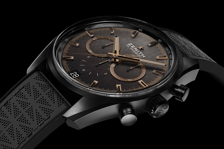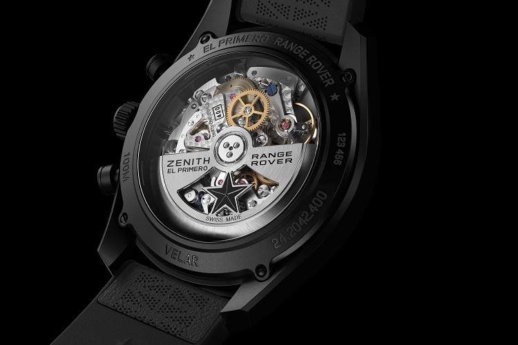 Zenith Chronomaster El Primero Range Rover Velar 由兩大頂尖品牌的設計和技術團隊共同研發。採用 42mm 特製陶瓷化鋁製錶殼,鑲嵌深灰色髮絲紋錶盤輔以銅色細節點綴,透明背殼清晰可見 Range Rover 與 Zenith 雙品牌刻印;錶帶包覆與 Range Rover 內裝座椅相同的深灰色頂級蘇格蘭小牛皮,並施以鑽石紋打孔處理,搭配鈦金屬摺疊式錶扣設計,盡顯極簡設計之美,結合全世界最精準的量產計時機芯 ─ El Primero,完美呼應 New Range Rover Velar 輕量化鋁合金車體的細膩工藝,與優雅簡約的時尚設計風格。