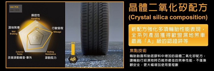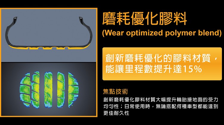 輪胎胎面層和胎底層膠料中的晶體二氧化矽配方(crystal silica composition),增強抗磨耗效果,延長輪胎使用里程數。輪胎優化的排水系統設計,提升車輛行經溼地時的輪胎排水效率,讓車輛行經濕地時留有最大接地面積,優異的煞車性能表現,獲得歐盟濕地抓地力的最高「A」級評等。