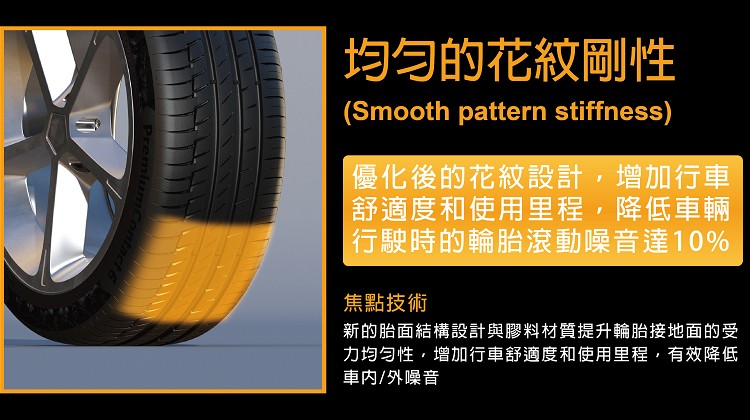 馬牌輪胎的化學家與工程師的突破性創舉,大幅提升了使用里程數、滾動阻力和舒適度等各方面表現,結合磨耗優化膠料(wear optimized polymer blend)與均勻的花紋剛性設計 (smooth pattern stiffness),讓PremiumContact 6 (PC6)的使用里程數比前代產品高出 15%,有效改善車內/外的滾動噪音高達10%。