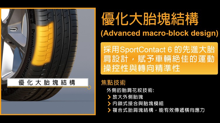 除了滿足安全性與舒適度的高度要求,另一項關鍵的開發重點則是讓所有車款都能獲得跑車般的操控性能。為達此目的,輪胎開發團隊沿用高科技 SportContact 6 (SC6) 的大胎肩設計,採用非對稱溝槽設計(asymmetrical rib geometry)。優化的胎塊結構設計(advanced macro-block design) 使用模組化的胎肩塊,互鎖設計讓胎塊彼此支撐,提供更高的抓地力,在過彎等各種路況能有效傳遞極高的應力。胎紋的非對稱溝槽設計在橫向應力的傳遞方面也達到相同標準。創新的胎塊設計讓PremiumContact 6 (PC6)的操控表現較ContiSportContact 5 提升3%。馬牌輪胎開發團隊研發出的創新膠料配方、花紋設計、及結合PremiumContact 6 (PC6) 的輪胎尖端科技,成功讓PremiumContact 6 (PC6) 這款新產品在操控性能、滾動阻力、使用里程數和舒適度等較前代產品最高提升達 15%。