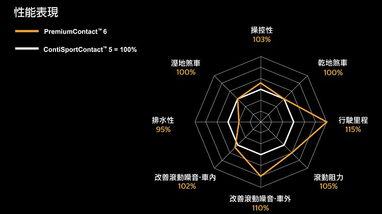 全新 PremiumContact 6 成功消弭運動操控與舒適乘駕的籓籬,讓操控性、舒適度、低滾動阻力與使用里程數,能於單一產品達成完美的均衡表現。PremiumContact 6歐洲原裝進口,產品結合ContiSportContact 5的運動操控與ContiPremiumContact 5 的均衡舒適,提供16-20吋等多款輪圈尺寸,適用於各式轎車與休旅車。
