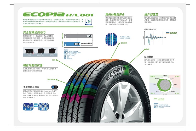 台灣普利司通憑藉優異品質與領先技術,繼推出廣受消費者好評的頂級SUV專用胎ALENZA、頂級都會轎車胎Turanza T005、高性能跑胎Potenza S007A後,今年第一季再為台灣消費者獻上年度新品ECOPIA H/L001 ,透過結構、胎紋設計與膠料配方的全面進化,消費者將能自信體驗ECOPIA H/L001於濕地中卓越的抓地力、更持久的輪胎壽命與全方位的舒適提升。