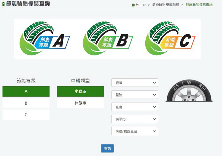目前輪胎產業聯盟已有正新、建大、普利司通、南港、登祿普、固特異及橫濱等 7 家輪胎業者參與,約占國內輪胎銷售量的7成。截至109年6月已核發正新、建大及南港等3家輪胎廠計8種型號,尺寸規格已可滿足絕大多數用車族群需求,想要節省荷包的消費者只要上網搜尋「節能輪胎標示」,即可在車輛節能應用技術研究網站中節能輪胎產業聯盟專區 (https://energy.artc.org.tw/Tire),即可取得已申請節能標誌的輪胎廠牌、輪胎型式、節能等級、濕地抓地力、節油效益估算等資訊,聰明選購適合的節能產品。