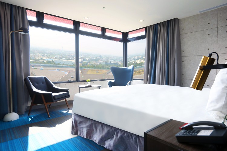 房間內部設計充滿運動元素,除了可以直接觀看賽車馳騁之外,連備品都是賽道包裝。不只房間設計,賽車飯店早餐也是一大特色,參考運動員的餐盤設計,依每個人的運動強度(低、中、高),從穀類、蛋白質、蔬果類,讓每位旅客取用適合自己的食材比例,攝取適量的早餐熱量,例如:以正常體重的上班族群來說,早餐建議約600-650卡的熱量,食材比例分配為,穀物類25%、蛋白質25%、蔬果類50%(實際依個人需求不同,可依國民健康署公佈計算每日建議攝取熱量),有專業營養師把關,讓旅客舒適住,健康吃,主廚也將在地農產入菜,新社菇類、梧棲漁港每日直送海鮮、中部食令水果等,別出心裁的用心與創意,跳脫以往的旅宿早餐體驗,早餐,也是累積能量的一站。