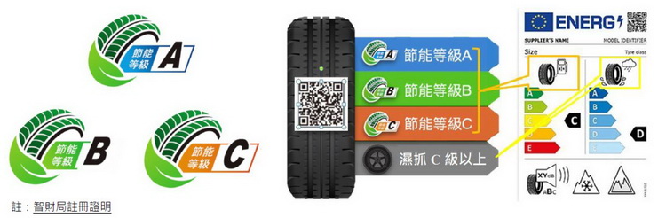 以國內輪胎銷售市場的現況來說,低滾動阻力、高濕地抓地力性能胎款的市佔比例已經成長至38%,但相對於已經施輪胎標示之國家相較仍有提升空間(例如歐盟50%;日本79%)。 歐洲、美洲、亞洲等各國陸續制定輪胎性能強制性能效標準及分級標示規範,限制不符合規範產品銷售及提供民眾產品選購資訊。讓消費者能夠更輕鬆地尋找到適合自己愛車的節能輪胎。 參考國外做法,國內也由能源局委託車輛中心於108年11月成立「節能輪胎產業聯盟」,建立輪胎自願性節能分級管理制度與相關推動事宜。節能分級管理制度的重要工作就是做出分級標示,揭露產品節能等級及其相關資訊,方便消費者作為選購參考,或許你會問,那為什麼輪胎不像車輛或家電一樣,直接由政府訂立分級制度與認定標準,而是要輪胎廠商自願性地去參與,申請非官方的認證呢?因為輪胎屬於被動性耗能產品,自己本身不消耗能量,政府自然無法直接去做分級管理。 節能輪胎產業聯盟所制定的節能分級區分為A、B、C等3個節能等級並以不同顏色明顯辨識;兼具現行「能源標章」之辨識明確及「能效標示」之效率等級之優點,明確引導消費者選購高效率產品。其中對各等級所訂定的節能/安全性能門檻,級距與國際一致,才能與國際接軌。