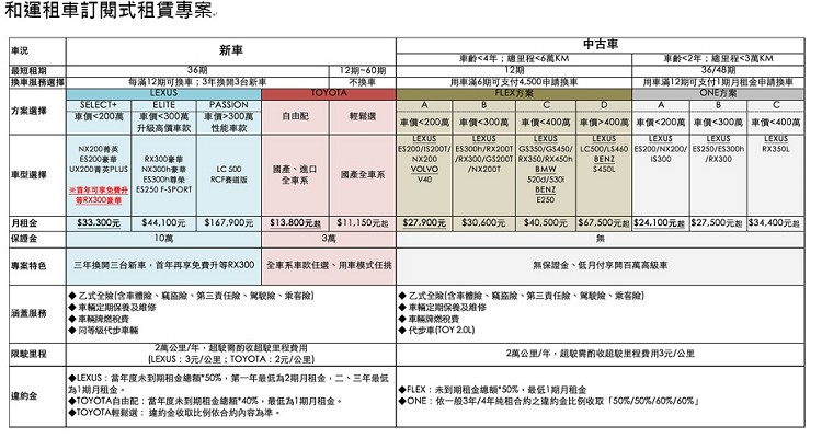 和運訂閱式租賃方案十分彈性多元,高級車的愛好者可選擇『LEXUS SELECT +專案』,最低月付33,300元起,每年可選擇NX 200菁英版、ES 200豪華版或UX 200菁英PLUS版新車,新用戶線上訂閱即可再享首年免費升級RX300豪華版。若不滿足於此,可再往上選擇LEXUS ELITE、LEXUS PASSAION專案,三種方案亦能自由搭配;至於偏好TOYOTA的忠實車主,則可選擇『TOYOTA新車自由配』,月付13,800元起,TOYOTA全車系均可挑選。從入門國產車VIOS到高級進口跑車TOYOTA 86,在3年訂閱期間都能隨心所欲搭配。預算有限的小資族能考慮與愛車培養革命情感,選擇訂閱期間一車到底的『TOYOTA輕鬆選』,月付11,150元起,TOYOTA國產車系任你挑;此外,想花小錢體驗高級車性能的車主,選擇『優質中古車訂閱專案』,免頭期款、免保證金,月付24,000元起,相當於租用國產車的花費,升格將LEXUS高級車當自家用車。中古車輛不僅具有保修履歷,更是通過和運勁拍中心(HAA)三大保證(無泡水、無重大事故、無車身引擎號碼變造),租賃期間還不用煩惱車子維修保養,租車安全無虞、有保障。 好康不僅如此,全訂戶還可享受和雲行動服務公司提供短天期租車平日6折、假日7折優惠。為鼓勵訂戶妥善用車,更額外加碼「優良訂戶酬謝方案」,若車輛於訂閱期間年度無出險紀錄且車況保持完好,次年度再贈送『和運VIP尊榮接送券』(限定年年換新車之訂戶)。一租多享的優質方案,是消費者最佳的用車新選擇! 欲知更多和運訂閱式租賃專案詳情,請洽和運租車服務人員,或連結至和運租車訂閱式租賃網站(https://car-subscription.easyrent.com.tw/ ),或電洽和運租車顧客服務中心0800-024-550查詢。