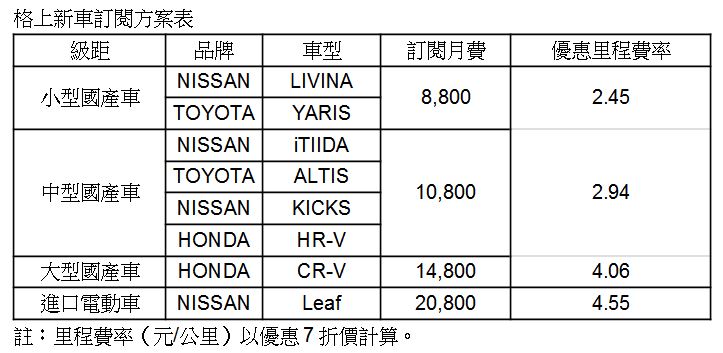 新上線的「格上新車訂閱」首波鎖定Nissan、Honda及Toyota三大熱銷品牌的八大車款,提供全新2021年新車,包括Yaris、Kicks、Altis、HRV、CRV、Tiida及Livina等七款市場熱銷車款,最低訂閱月費8,800元,還能享有限時里程費7折折扣。