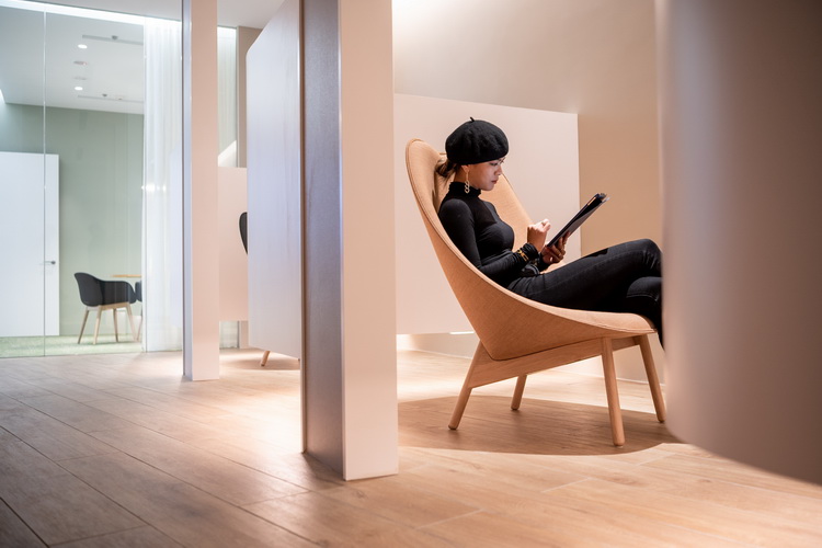大廳盡頭設有三間獨立氣派的交車室,若隱若現的透黑玻璃讓每一位新車主在拉開滑門的瞬間,都能擁有拆開禮物的期待感。值得一提的空間巧思莫過於客休區的獨立休息區,仿造飛機頭等艙的私人空間感,擺放單人使用的北歐單椅茶几,為每一位需要專心辦公或休息的車主營造安全感;一切從「人」出發,提供賓至如歸的精緻體驗。