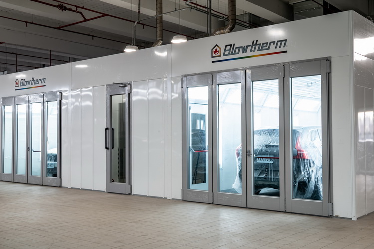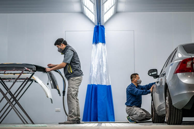 四樓中古車展示中心與鈑金烤漆區比照三樓新車展示空間,同樣有著挑高空間與大片落地窗,在充滿陽光的空間裡可一次展示 7 部 VOLVO 車款。隔著一道牆就是讓每部車重生的鈑烤區,除設有車身鈑金手術台外,三座符合瑞典原廠規範的研磨工位同步採用節能、低噪音、變頻控制的進排氣流過濾粉塵,更斥資近 1,600 萬設置兩座義大利進口 BLOWTHERM 變頻無塵式水性漆烤漆爐,全程電腦控溫可有效提升烘烤效能,其智能管理系統可降低 20% 燃料消耗,同時採用活性碳過濾系統降低有害氣體排放,真正落實友善環境精神。