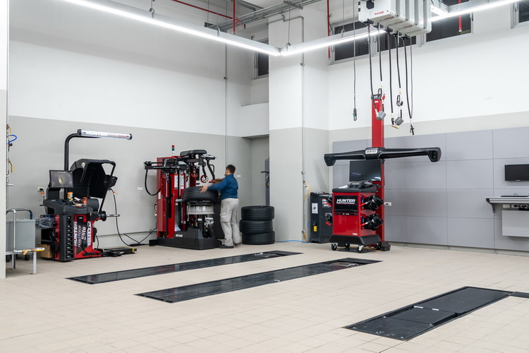 透過新一代滑軌式廢氣排放系統,可有效控制室內維修廠區的空氣品質;全功能輪胎工作站採用全台少見的 HUNTER ELITE 3D 四輪定位機、HUNTER TCRH 全自動拆胎機與 HUNTER RFE 道路模擬平衡機,提供精準、精緻、高效的輪胎拆換及定位服務。戶外另有 2 座配置 24 顆低溫鍍膜紅外線烤燈的美容中心與洗車專區,讓 VOLVO 車主每一次回廠都能感受到最無微不至的售服旅程。