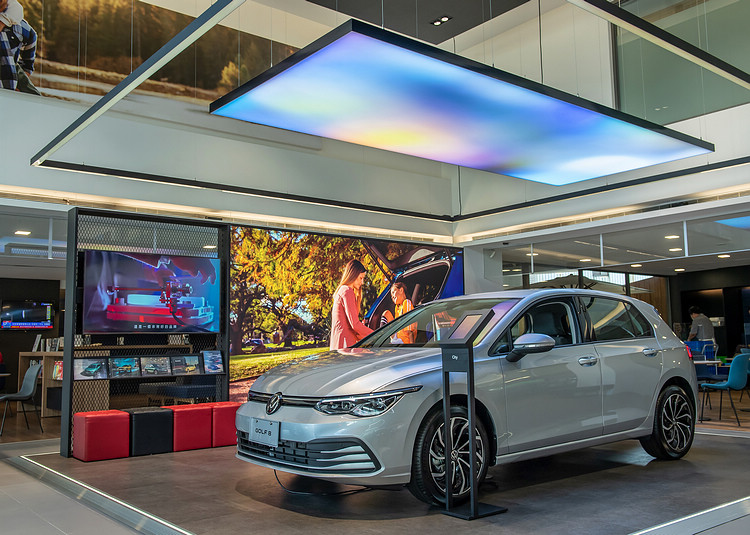 ![]() ▲車輛展示區,根據各車款特色分為City、Family、Performance、Premium四大區域,消費者可輕鬆依照用車需求體驗適合車款。展示中心不僅整合數位化的賞車服務,更為所有車主打造舒適安逸的休憩空間,包含咖啡點心吧、精品配件區和兒童遊戲區。未來在進入室內空間後,消費者將浸營在Volkswagen全新五感體驗中,空氣中飄散著Volkswagen特製香氛,耳邊播放著Volkswagen專屬歌單,創造輕鬆無壓的室內氛圍,大量原木色訂製傢俱打造出溫暖放鬆的氛圍,車主將可在咖啡點心吧台區享用Volkswagen精心準備的風味小點與氣泡調飲,從嗅覺、聽覺至味覺,進入Volkswagen深具活力的感官體驗中;消費者還可以在精品配件區選購原廠精品,包括車輛配備、原廠服飾及生活用品,所有人都能創造專屬Volkswagen的生活風格。 ![]() ▲重點產品展示區有可變換顏色的天幕和LED螢幕播放最新產品影片,顧客可透過一旁的數位車輛規格立牌,了解詳閱產品規格、相關影片及最新銷售方案。