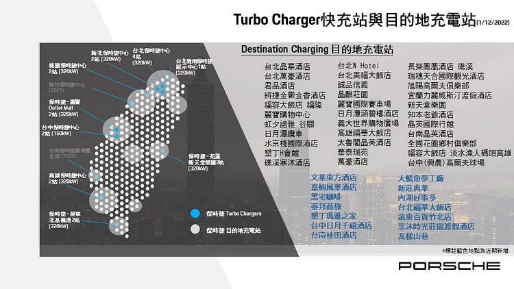 ![]() ▲台灣保時捷力求打造更加完善的環島充電網,於屏東北基楓港加油站新增高速充電站。除了保時捷高速充電站,台灣保時捷近期也新增17處目的地充電站 (Destination Charging),包括台北文華東方酒店、台北內湖好事多、遠東百貨竹北店、台中日月千禧酒店、台南臺邦商旅、嘉義市嘉楠風華酒店、墾丁瑪雅之家,以及更多據點。截至今日,保時捷在台共設置 9 處保時捷高速充電站 (Turbo Charging),包含19支充電樁,以及48處目的地的充電站 (Destination Charging),涵蓋全台豪華度假飯店、高爾夫球場及賽車場等地,合計共100支充電樁,服務網路遍及全台各地。 ![]() ▲台灣保時捷高速充電站與目的地充電站列表