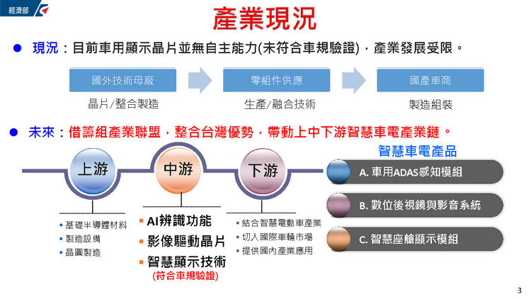 整合聯盟成員車電技術 打造上中下游智慧車電產業鏈 為打造中下游智慧車電產業鏈,財團法人車輛研究測試中心董事長 黃隆洲、義隆電子股份有限公司董事長葉儀晧、友達光電副總經理洪泓杰、奇美車電總經理徐學賢、中華汽車副總經理楊鴻慶、華德動能總經理楊誌榮、成運汽車總經理吳忠錫、創奕能源董事長黃振聲、大聯大品佳集團董事長陳國源均出席並簽署這象徵車用電子晶片發展新里程的「車用AI影像晶片與智慧座艙顯示模組產業聯盟」MOU,現場並邀請經濟部次長林全能、技術處副處長林德生等人出席見證,未來聯盟成員將充分發揮所長,精銳盡出共同打造車電護國群山,相關技術包含: