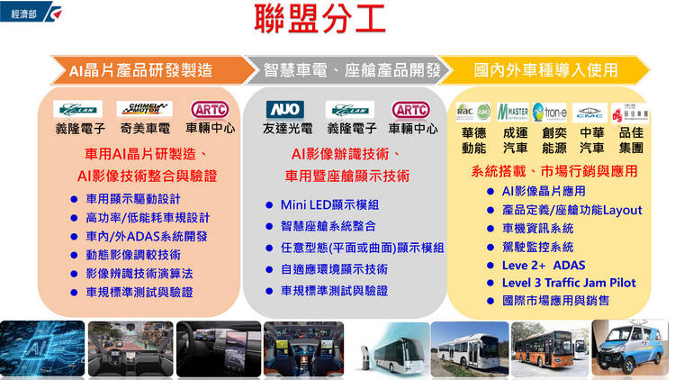 財團法人車輛研究測試中心(簡稱ARTC、車輛中心)於今(18)日宣布與義隆電子、友達光電、奇美車電、中華汽車、華德動能、成運汽車、創奕能源、大聯大品佳成立「車用AI影像晶片與智慧座艙顯示模組產業聯盟」共同簽署MOU,將結合上中下游產業鏈,建立國內自主車用IC顯示技術能力、開發自主設計車用AI影像暨Mini LED顯示運算晶片組。 結合任意型態顯示技術,建立智慧座艙產業自主技術,研製符合國際車用影像感測晶片之ADAS應用模組與系統,並依照電動車廠(EV Bus、EV Car)智慧座艙需求,結合艙內外感測AI技術,打造車輛智慧化的關鍵技術,提升產業價值,建造車電護國群山。