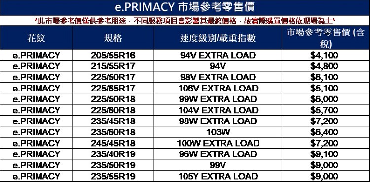 e.PRIMACY天生適電 駕馭里程不再焦慮![]() 因應汽車市場趨勢,米其林決定於今年導入專為新能源車開發的e.PRIMACY,提前為迅速膨脹的新能源車輪胎市場做準備。米其林將新能源車主遇到的痛點,都納入產品研發的重點項目。目前e.PRIMACY供應主要尺寸為 16~19 吋,寬度從 205~245 mm、扁平比從 40~65為主。e.PRIMACY三大產品特色如下: 1.嶄新技術 創造最佳續航里程加強胎冠、胎體層編織材質與結構,使輪胎達到輕量化,並使用低生熱橡膠配方,有效降低輪胎的滾動阻力减少車輛行進的能耗。上述技術使e.PRIMACY 與一般輪胎相比滾動阻力可降低29%,進而提升續航里程8%。 2.胎面受力均勻化獨家科技 增加輪胎使用壽命為使輪胎表面可以均勻接觸地面並平均受力,提升整體使用里程,e.PRIMACY採用獨家MAXTOUCH CONSTRUCTIONTM壓力均勻化科技,不僅可增加接地面積,也提升18%輪胎使用壽命。 3.靜音設計 提升駕乘舒適感e.PRIMACY使用PRIMACY靜音花紋設計,能恆定接地面積達到固定滾動頻率,有效降低駕駛疲勞感。在19吋胎款上更結合Acoustic靜音科技,在胎體結構中置入靜音棉,更有效抑制行駛間的空腔噪音。