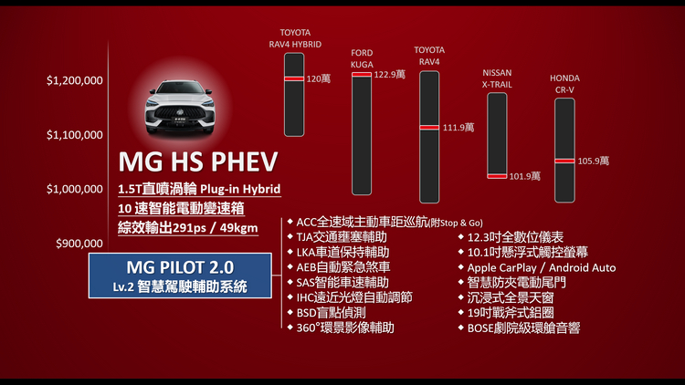 英國車壇百年MG品牌今日正式由總代理台灣英倫摩里斯(MG Taiwan)宣佈導入,MG Taiwan總經理陳宗裕除了對外闡述MG汽車的品牌經營理念、極具競爭力的產品規劃、完善的經銷體系佈局,以及結合線上與線下實體據點服務的新銷售模式之外,還首度展演MG在台第一款由中華汽車製造生產的全新力作 – HS 1.5T汽油渦輪與HS PHEV油電動力車型,表達MG品牌深耕台灣永續經營的企圖與決心。 MG HS重點規配表