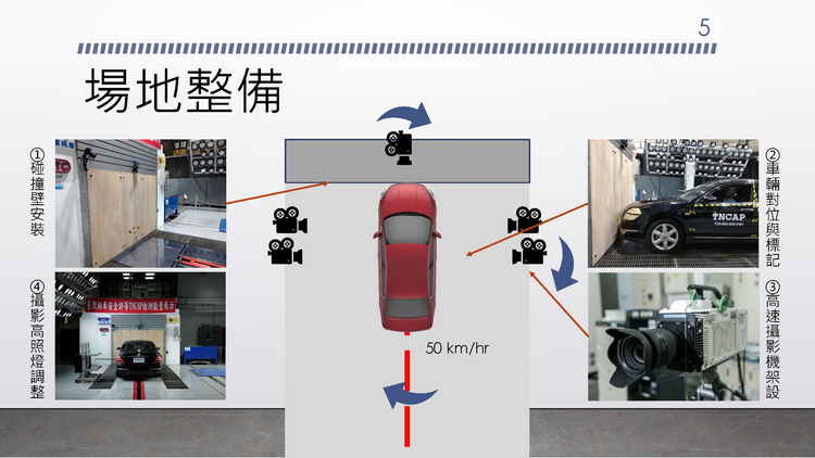 對於場地的整備則包括了1:碰撞壁安裝。2:車輛對位與標記。3:高速攝影機架設。4:攝影高照燈調整。