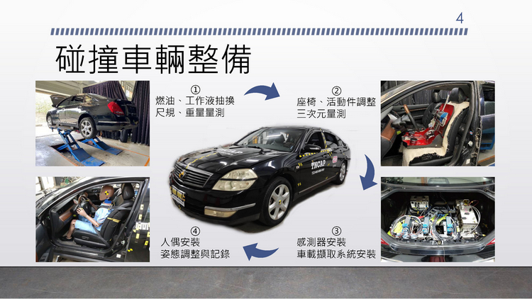 在測試前要對車輛進的整備包括1:燃油、工作液抽換,尺規、重量量測。2:座椅、活動件調整、三次元輛測。3:感測器安裝、車輛擷取系統安裝。4:人偶安裝、姿態調整與紀錄。