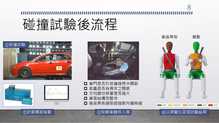 碰撞測試完畢之後,工作人員就會去讀取計算測試人偶所回傳的傷害指數,並檢查車門是否於碰撞過程中開啟、氣囊是否有異常之開展、方向盤位移量是否過大、車室結構完整性、後座乘客頭部是否超過前前向偏移線等評估的項目。最後再以視覺化方式來呈現結果。