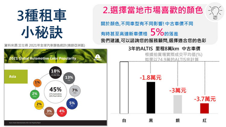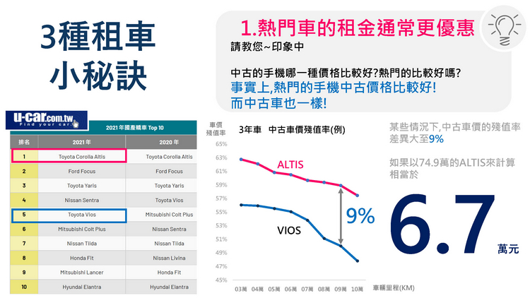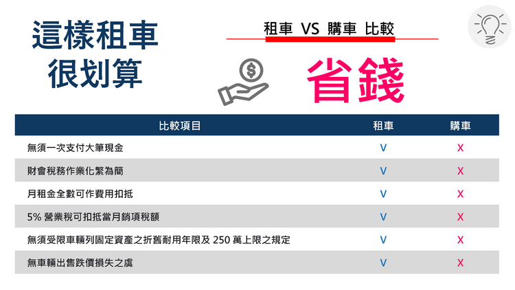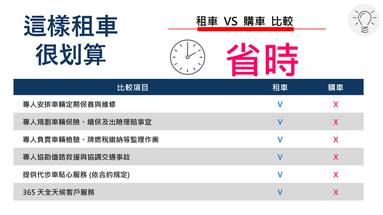 選擇歐力士租車的好處在於無須一次支付大筆現金,若以公司租賃還能簡化財會稅務作業、月租金全數可作費用扣抵、5% 營業稅可扣抵當月銷項稅額、無須受限車輛列固定資產之折舊耐用年限及 250 萬上限之規定、無車輛出售跌價損失之疑慮。 對比傳統購車流程在省時方面,歐力士租車會以專人服務的方式安排車輛定期保養與維修、保險及出險理賠事宜、車輛檢驗及牌燃稅繳納等監理作業、道路救援與協助交通事故、提供代步車服務(依合約規定)、365 天全天候客戶服務,以最用心快速的方式符合客戶的期待。