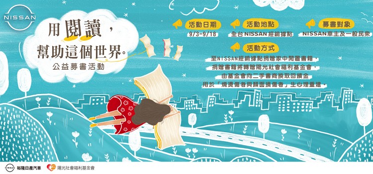 疫情持續影響社福團體募款及資源捐助,裕隆日產汽車深知社福腳步不能停下,自2020年迄今持續3年攜手陽光社會福利基金會辦理CSR募書活動,並邀請全體同仁及經銷商夥伴共同響應,書店收購募集之書籍將轉為回饋金,全數捐作為陽光社會福利基金會運作款項,協助「燒傷者與顏面損傷者生心理重建服務」計畫,期望能藉此達到拋磚引玉的目的,增進社會大眾對燒傷者與顏面損傷者的了解、接納與支持,並召集更多人共同支持社會公益。