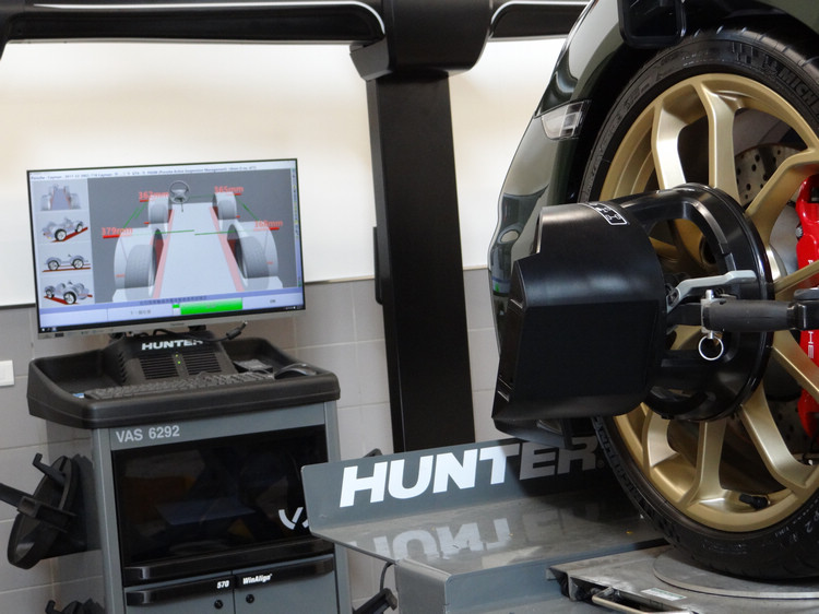 美國HUNTER HawkEye Elite 3D四輪定位儀:HUNTER 3D數位攝影裝置結合車輪上的監測感應器,可以即時檢測並精準運算出各個輪圈的傾角及偏差,高階的底盤量測功能提供車身高度、電子方向盤歸零校正及車輛定位角度的數據建議。整套定位儀可以搭配保時捷車系ACC系統的校正功能;專利的快速夾具,還能確保使用時不傷到輪框。