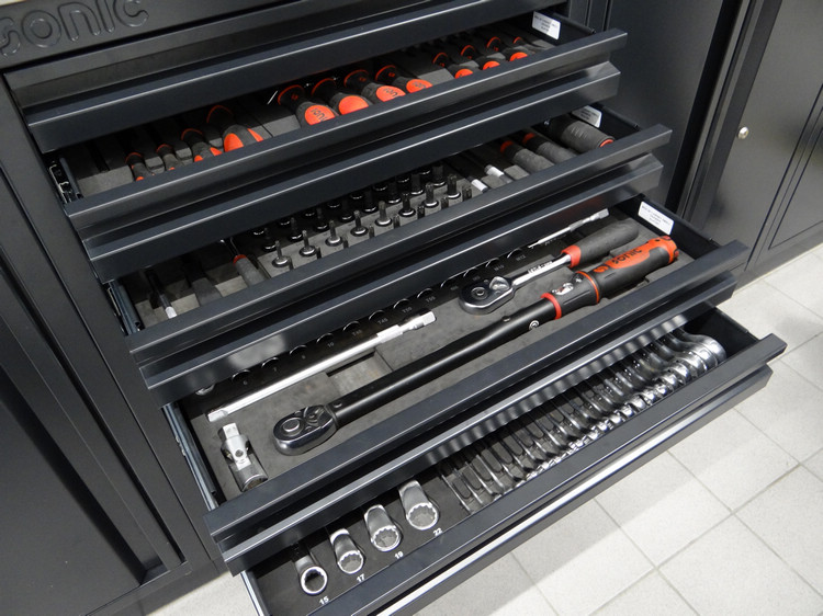 SONIC MSS專業級系統工具櫃:售後服務區共設有8個引擎機電工作位,每個工作位皆配置量身訂製通過德國保時捷原廠 VAS 認證並符合德國 DIN 工業標準的SONIC MSS專業頂級客製化系統工具櫃、專屬零件存放手推車及保時捷車款專用全套工具組,完整落實「工具&零件不落地」的頂級作業概念
