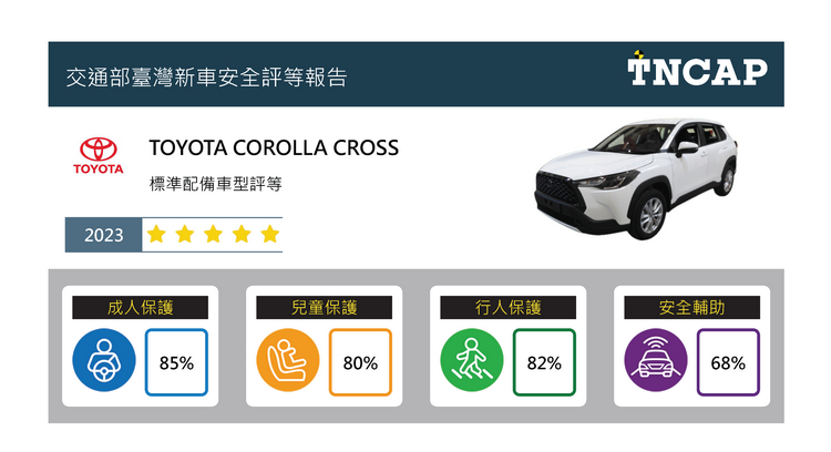 得成人保護 85%、兒童保護 80%、行人保護 82%及安全輔助68%,依據星級評等平衡標準規定,Corolla Cross車型整體星級評等為五顆星。