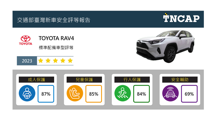 TOYOTA RAV4則於四大安全領域得分率中分別獲得成人保護87%、兒童保護 85%、行人保護 84%及安全輔助 69%,依據星級評等平衡標準,RAV4 車型整體星級評等為五顆星。兩車款雖然都與ENCAP一樣在TNCAP拿下五顆星評等,但在分項項目的安全輔助項目是比ENCAP的成績低些,這是因為歐規車型與進口至台灣車型的配備差異所導致。而這也正式TNCAP成立的意義所在,希望能夠過評等機制,促使車廠/車商引進或在國內生產的車輛品質與安全配備能夠比照國際的高規格。