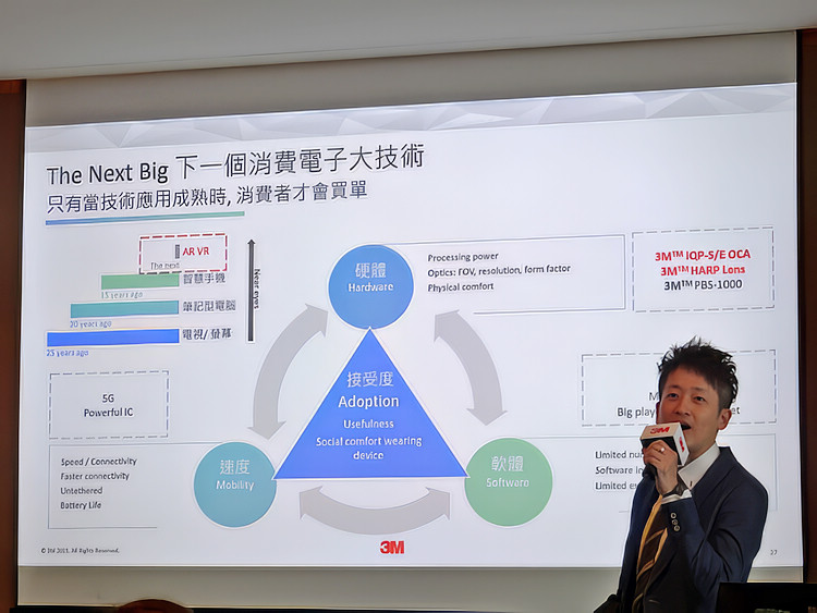 用科技改善基礎設施及用路安全3M同時還為汽車製造業的自動化生產投入研發心力,結合創新材料與研磨工藝系統,推出3M Finesse-it機器人自動化漆面修復系統,透過自動識別車輛漆面缺陷,指導機器人利用3M專業研磨產品對車輛進行打磨和拋光,全面破解傳統車輛漆面缺陷處理需要大量人力的難題。 ![]() ▲3M顯示材料與系統產品部工程師呂孟翰指出,唯有導入先進材料,提高消費者對於科技產品的使用體驗,VR虛擬實境穿戴裝置才有普及的一天。