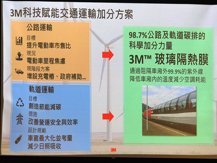 以先進材料提高電動車效率![]() ▲3M為電動車導入先進顯示材料,讓抬頭顯示器、駕駛行為偵測、電子後視鏡和資訊顯示來達成更佳的設計、安全和效率。在汽車相關領域方面,3M正與汽車廠商及配件供應商合作,從熱管理、裝配、絕緣等角度入手,目的是在提高電動汽車性能的同時,能夠降低鋰電池在生命周期的碳足跡。3M指出,3M所開發的先進顯示材料,可減少耗能並降低冷卻能耗;3M中空玻璃球的高強度、低密度特性,則可應用在不同材質中減輕高達30%甚至更多的重量,讓車身更輕盈的同時依然堅固,有效改善續航里程;至於3M專利汽車隔熱紙,則可利用光學原理隔絕太陽能和紅外線,在保有清晰透光度的同時確保車內更涼爽以及耐用的特性。 ![]() ▲3M透過玻璃隔熱膜,讓大開窗的大眾運輸工具避免過度使用冷氣,影響續航里程,或是降低對於電力的依賴。