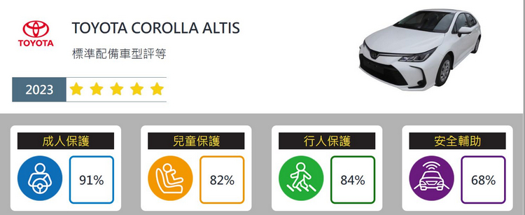 首先在TOYOTA Altis部分,在成人保護、兒童保護、行人保護與安全輔助上各獲得91%、82%、84%與68%的項目配分。在各個領域中都是五顆星的表現,所以最後就以五顆星作為整體的評等結果。要注意的是,此評等只適用於汽油引擎車型,油電動力車型不包括在內。