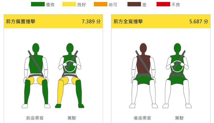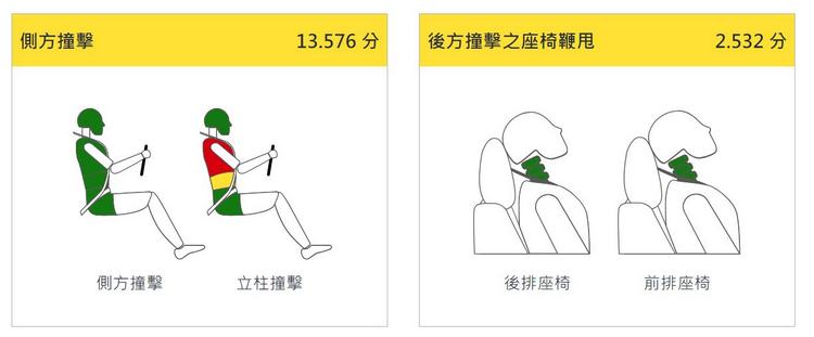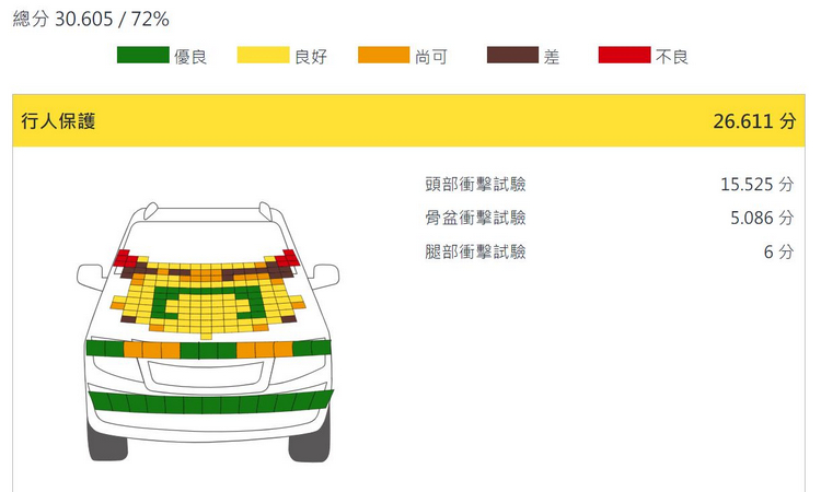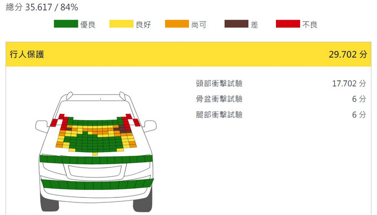 而在行人保護項目中,在頭部遭受撞擊試驗時,車輛A柱及其周圍擋風玻璃底部較為堅硬致頭部保護性能評為「差」或「不良」,其餘引擎蓋位置大部分具有「優良」或「良好」保護效果。