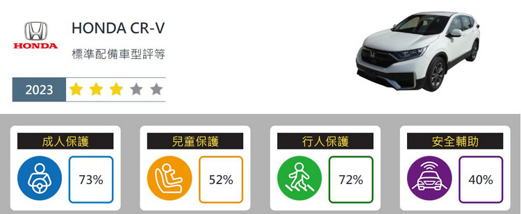HONDA CR-V則是在四大項目中分別拿到73%、52%、72%與40%的配分,其中在兒童保護項目的星級為三顆星是各項目中最低,所以整就取三顆星作為最後的整體評等。