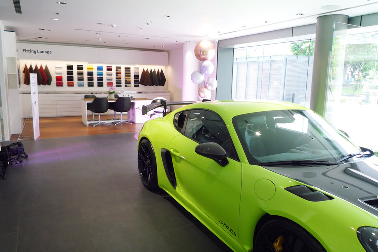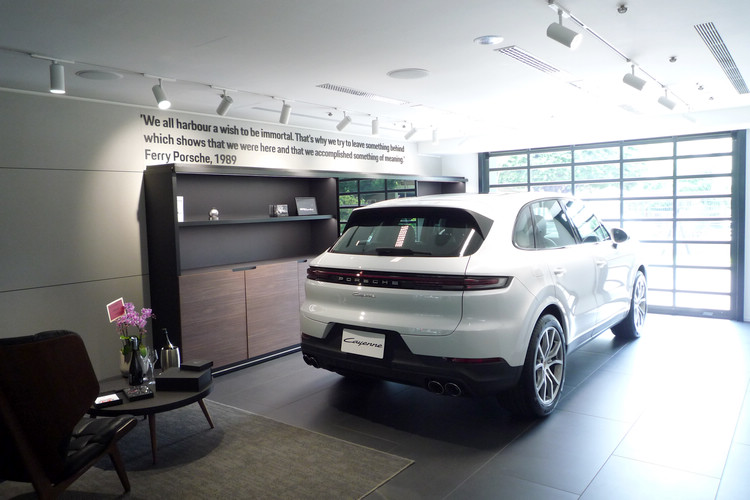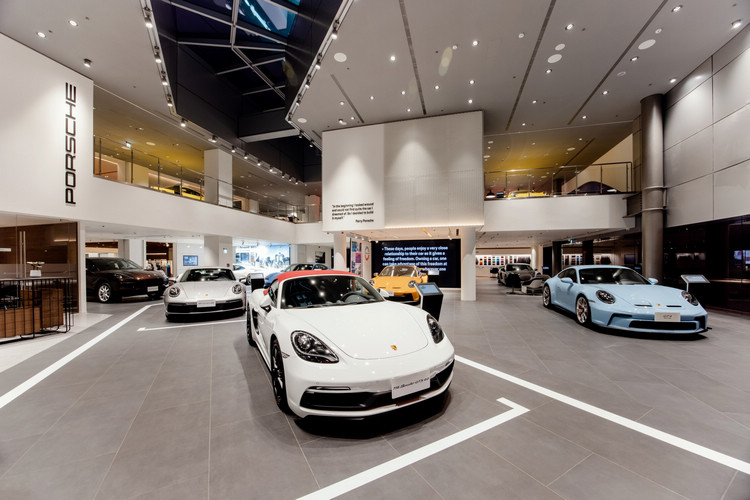 開放式的展示空間內陳列展示了多部保時捷車款,採用的鋁製 LED 燈具完美結合了金屬與木質裝飾,呈現開放的「Racing Line」設計風格。