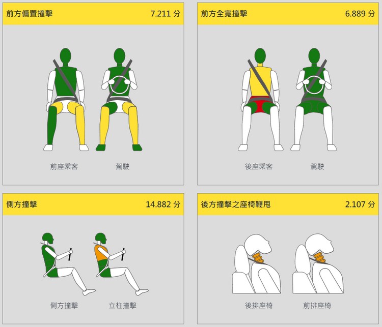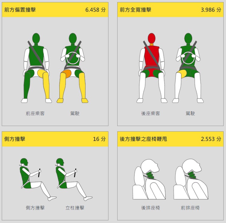 YARIS車型執行TNCAP四項撞擊試驗後,在前方偏置試驗時駕駛座腳踏區有破裂且煞車踏板有卡住情況,對於足部恐造成嚴重傷害,故予以扣分。前方全寬撞擊試驗時,後座乘客人偶未能有效束縛以致骨盆滑到安全帶下方,且後座乘客因頭部及胸部受到嚴重傷害,超過規定限制值,其保護性能均評為「不良」,故該人偶不予給分。其他碰撞測試則多為「優良」保護效果。