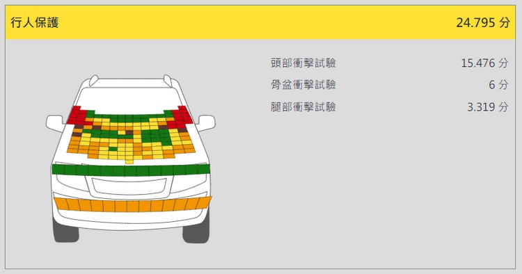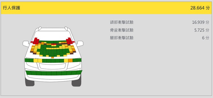 行人保護方面,在頭部衝擊試驗時,當頭部撞擊至車輛A柱及其周圍擋風玻璃底部的保護性能評為「差」或「不良」,其餘引擎蓋位置大部分具有「良好」或「尚可」保護效果;在骨盆衝擊試驗與腿部衝擊試驗時,車輛前方結構對於行人骨盆具有「優良」保護效果,但保險桿對於腿部造成較大的衝擊力量致保護性能評為「尚可」接受。