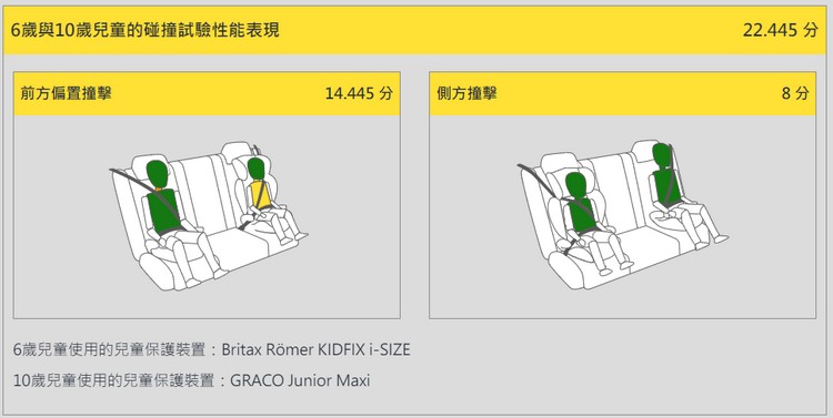 而在對6歲與10歲兒童的碰撞性能表現,不管是前方偏置撞擊與側方撞擊試驗,也多半獲得「優良」與「良好」的保護評價。且可正常安裝通用型、ISOFIX與i-Size的兒童保護裝置。另車輛於第二排左側及右側具有可安裝i-Size兒童保護裝置的功能且均有i-Size標識,並可容納較大型後向兒童保護裝置。