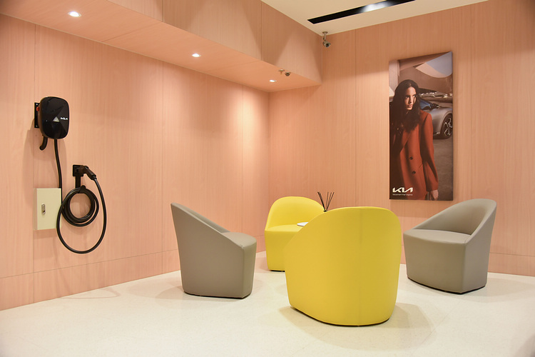 ▲EV交車區設置專屬充電座,搭配以暖光木質風格打造的客休區,為消費者打造優質貼心的服務享受。