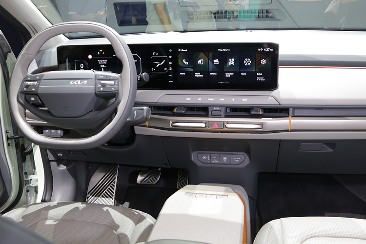 現場展出的多款量產版及概念車中,最受矚目的正是甫於全球發表的EV3純電智慧跨界休旅。EV3車長4.3米,軸距長達2.68米,與EV6、EV9同樣採用Kia E-GMP平台打造,車內乘坐及載物空間相當寬敞,配備一體式全景顯示幕,以及可延伸120mm的滑動式中控桌以及人體工學座椅,並標榜採用了10大永續材質來製造。