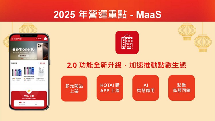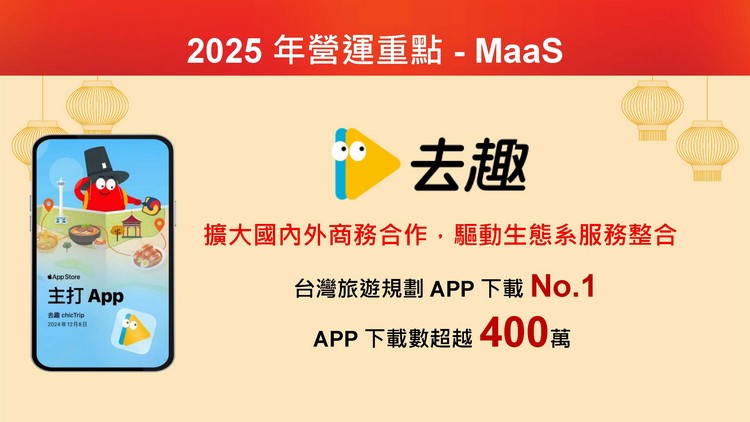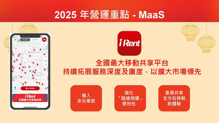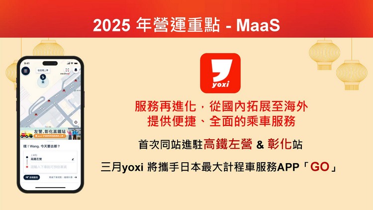 和泰集團持續以MaaS為願景,打造全面的「移動服務體驗」。2023年甫推出旅遊規劃APP「去趣」,去年已成為台灣旅遊規劃APP下載No.1,2025年App下載數目標超越400萬,擴大國內外商務合作,掌握觀光商機。和泰集團點數購物商城「和泰購」將加入智能搜尋及個人化AI推薦,並推出APP,提升會員消費體驗。另外,yoxi將進駐左營與彰化高鐵站,並推出高鐵特約計程車功能;更推出跨國叫車服務功能,使用「去趣」打開yoxi APP即可搭乘日本計程車,實現台日無縫銜接的叫車體驗。iRent則將擴大路邊租還服務範圍,並將帳號整合集團旗下用車服務,提供會員更便利的使用體驗。
