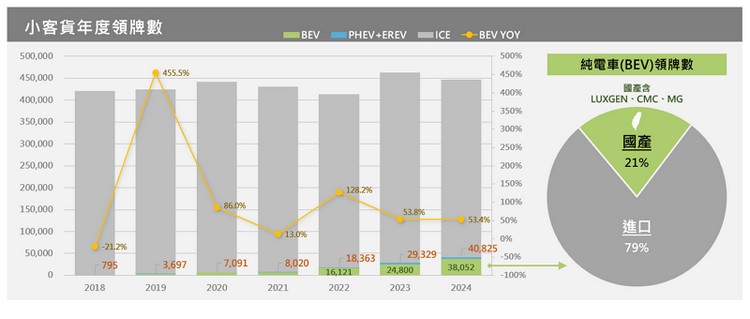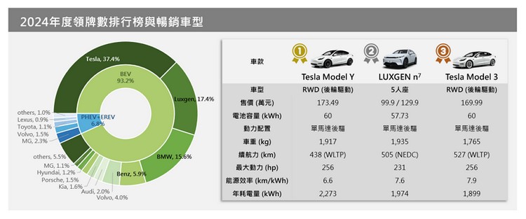 ![]() ▲2024年臺灣電動車登記數國內純電動車市場2024年銷售3.8萬輛,年增達53.4% ![]() ▲2024年臺灣電動車領牌數統計2024年度銷售,電動車銷售前三大品牌及占比依序為Tesla 37.4%、LUXGEN 17.4%及BMW 15.6%,詳如圖3,其中除了LUXGEN n7銷售成績亮眼以外,BMW因推出多款涵蓋不同消費群體需求的電動車型,讓銷售也突破新高;銷售前三名車型分別為Tesla Model Y的RWD、LUXGEN n7的5人座、Tesla Model 3的RWD,皆擁有優秀的續航力表現與能效測試值表現,拿下2024年年度銷售前三名的成績。 ![]() ▲2024年臺灣領牌數排行榜與暢銷車型今(2025)年已預告將會上市的國產純電車共有兩輛,第一輛是鴻海的原型車款Model B,定位為平價電動跨界小跑旅LUXGEN n5 (2023年註冊商標),主打年輕市場且售價預計落在百萬內,預定於2025年第二季末上市,有望成為國產價格最親民的純電小客車;第二輛為中華汽車的純電貨車 ET35 (2024年註冊商標),於2024年法說會上公開發表,規劃將在電動貨/商車產線上進行量產,為國產第一輛電動商用3.5噸貨車,預計將在今年優先提供給物流業者使用,零件在地化供應鏈合作價值比率高達9成以上。 進口品牌方面,為了搶攻消費者的軟性需求,車款引進策略有朝向較為平價且符合大眾需求的趨勢,各品牌近期預告將於2025年上市的電動車款中,多為貼近近年消費者使用習慣的平價純電 SUV,包含Toyota Urban Cruiser、Kia EV3、Hyundai Inster、Volvo EX30、Škoda Elroq等,另外也將有許多高階車款(如Maserati GranCabrio Folgore、Audi Q6 e-tron、Volvo EX90…)等預計規劃導入。