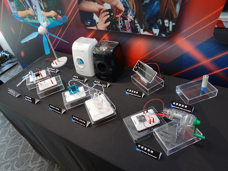 ▲現場展示用於賽車的產氫及儲氫零組件,以及相關的教學套件。