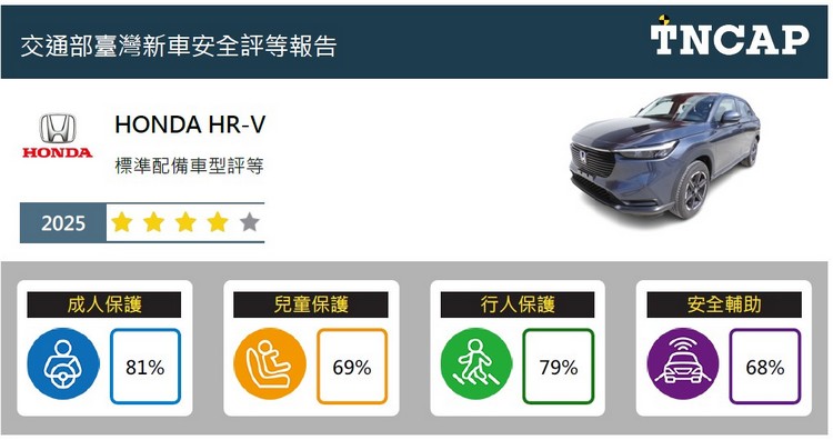 兒童保護部分在前方偏置撞擊與側方撞擊實驗下對於身體重要部分保護效果皆為滿分。後座椅也可正確地安裝所有類型(通用型、ISOFIX及i-Size)的兒童保護裝置。車輛於第二排左側及右側具有可安裝i-Size兒童保護裝置的功能且均有i-Size標識,並可容納較大型後向兒童保護裝置。 行人保護部分因配備主動式前方車蓋並符合不同行人體型及車速運作之規定,實驗時當頭部撞擊至車輛前方車蓋位置大部分具有「優良」保護效果,僅車輛A柱、擋風玻璃底部及部分葉子板位置的保護性能評為「差」或「不良」被扣了些分數。所配備的緊急煞車輔助系統人機介面全部功能符合規定且在幾項行人碰撞情境試驗下都未發生碰撞傷害。 安全輔助部分因為所配備的車速輔助系統無法於車道路線全程顯示車速限制資訊,以及無法辨識時間、天氣及車輛類別之交通標誌;另車速超過道路速限時,系統雖能有效以視聽覺警示駕駛,但未具備速度限制功能,被扣了一些分數。在車輛偏離行駛車道時也因為人機介面部分功能未符合規定而有扣分。但其他項目及緊急煞車輔助系統的試驗項目則都有良好的表現。 又虧在安全輔助!? HONDA HR-V獲四顆星 HONDA的中小型運動休旅車HR-V於四大安全領域得分率中分別獲得成人保護 97%、兒童保護 89%、行人保護 78%及安全輔助 79%,整體星級評等為四顆星。