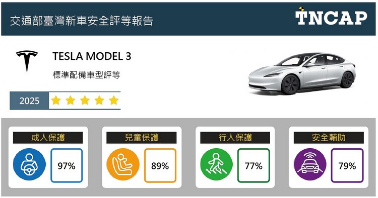 ![]() 延續Model Y好表現 Model 3續拿五顆星