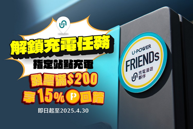 為歡慶「U-POWER FRIENDs 充電漫遊夥伴」功能正式上線,並歡迎會員們造訪U-POWER FRIENDs站點,同步推出U-POWER充電任務回饋活動!即日起至2025.04.30,凡於「U-POWER FRIENDs充電漫遊夥伴」站點充電,單筆消費發票金額滿(含)200元,即可獲得15% U-POINT回饋。回饋無上限、充越多越划算!詳細活動須知及辦法請參閱 U-POWER 官網:https://www.u-power.com.tw/event/campaign20250408.html