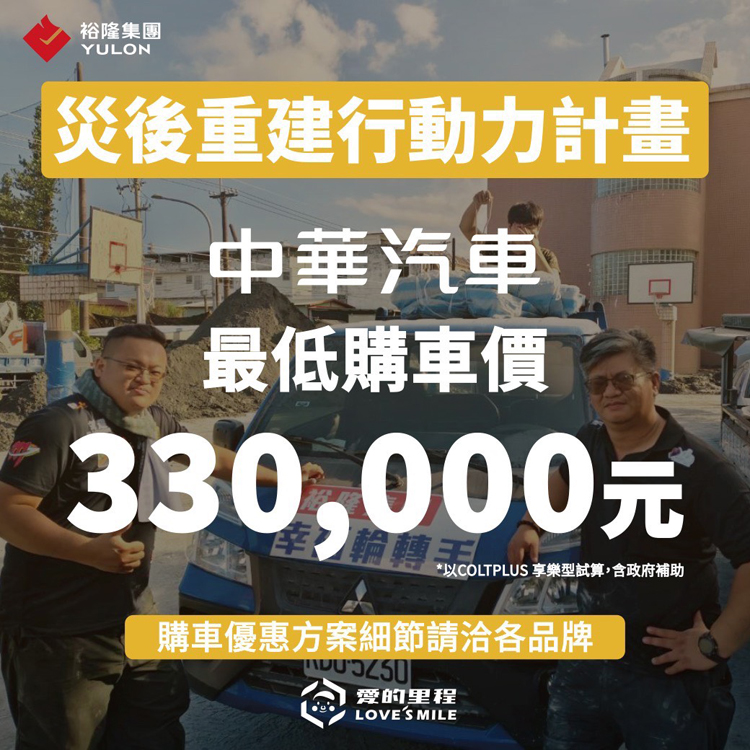 ![]() 此外,鑒於花蓮光復鄉洪災造成大多數民眾車輛泡水報廢,未來仍有交通購車需求,裕隆集團旗下中華汽車、裕隆汽車、台元紡織提撥1500萬元,用以實質捐贈,預計捐出15台集團品牌車款,同時,中華汽車、裕隆汽車也提撥專款1000萬元,提供光復鄉受災車主選購中華三菱、NISSAN車系以及LUXGEN車系的的專屬優惠購車方案。補助災民中華三菱最低購車價近33萬,NISSAN最低購車享48.8萬,LUXGEN購車最低價54.9萬,協力降低災民移動上的負擔。