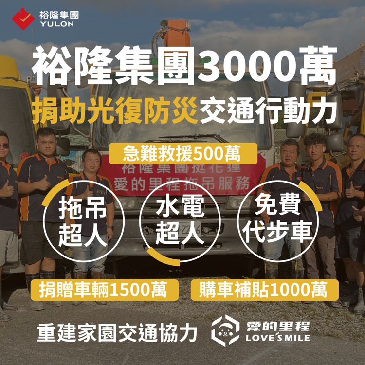 ![]() 裕隆集團期望透過全方位交通服務設計與實質捐助,為光復鄉提供快速配套的交通賦能方案,同時,關照在地組織與居民行動力,提供貼近災民需求的交通協助與購車補助方案,給予最堅實的「移動」支持,陪伴花蓮光復鄉度過艱難的重建期,直到家園恢復元氣。裕隆集團堅信,每一趟出行背後,都支撐著地方的日常與重建的希望,期盼陪伴光復鄉災民與投入救援的超人,補上重建家園的最後一哩路。