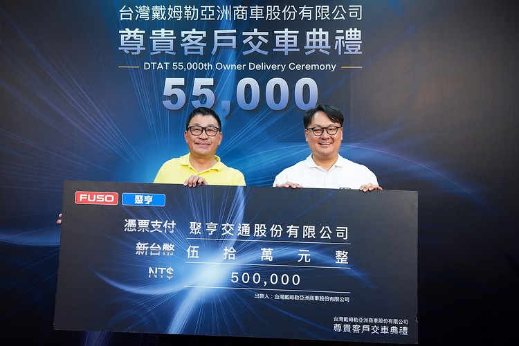 FUSO總代理台灣戴姆勒亞洲商車(DTAT)歡慶第 55,000 輛 FUSO 新車交車,10 月中旬特別為車主「聚亨交通股份有限公司」舉辦頒獎典禮暨慶祝活動,DTAT執行長朴正祐親自頒發50萬元購車金及專屬獎座,感謝客戶長久支持與肯定。